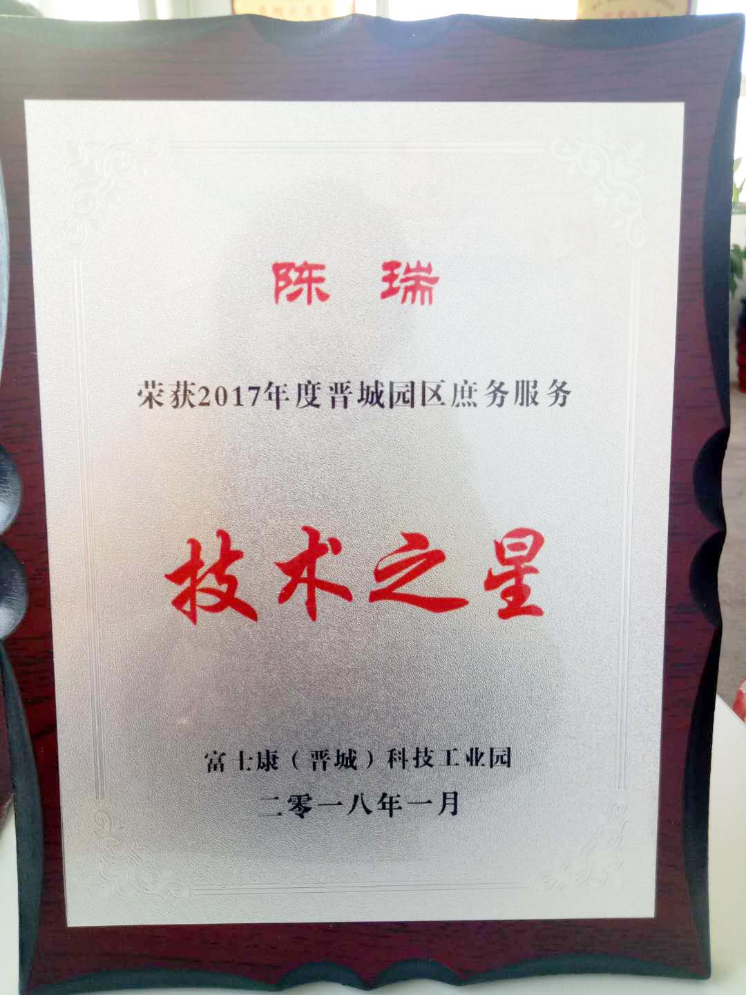 近日,在富士康(晉城)科技工業(yè)園舉辦的2017年度晉城園區(qū)庶務服務年終評比中,我公司員工陳瑞榮獲“技術(shù)之星“的稱號,這份榮譽是陳瑞總結(jié)日常工作所得經(jīng)驗再加上自身的刻苦鉆研,勤勞肯干的精神取得的。