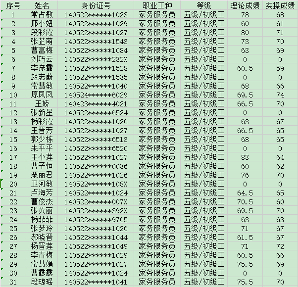 2024831日第33批家政服務(wù)員初級(jí)認(rèn)定人員成績(jī)公示