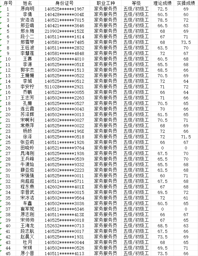 晉城市潔霸清潔服務(wù)股份有限公司職業(yè)技能等級認(rèn)定中心現(xiàn)將2024年9月28日認(rèn)定人員成績公示如下: